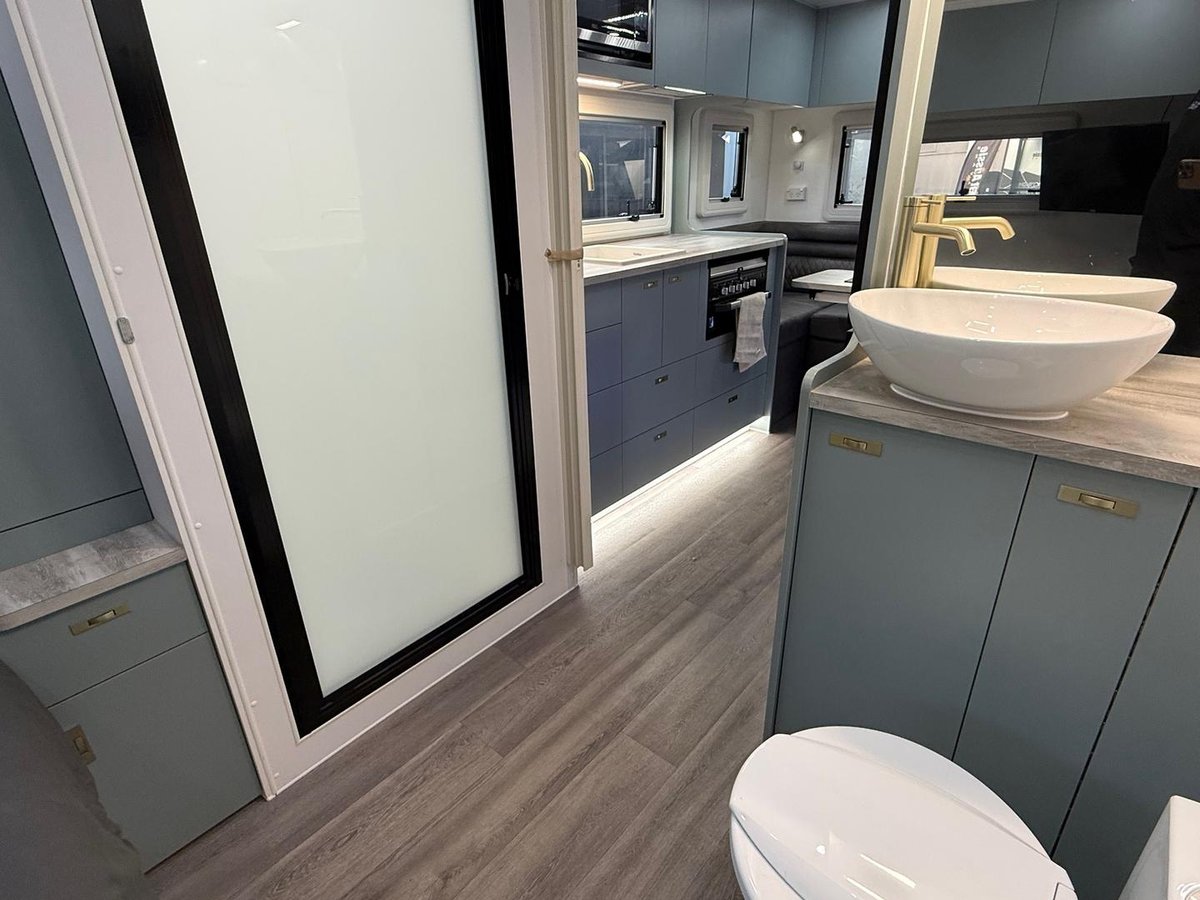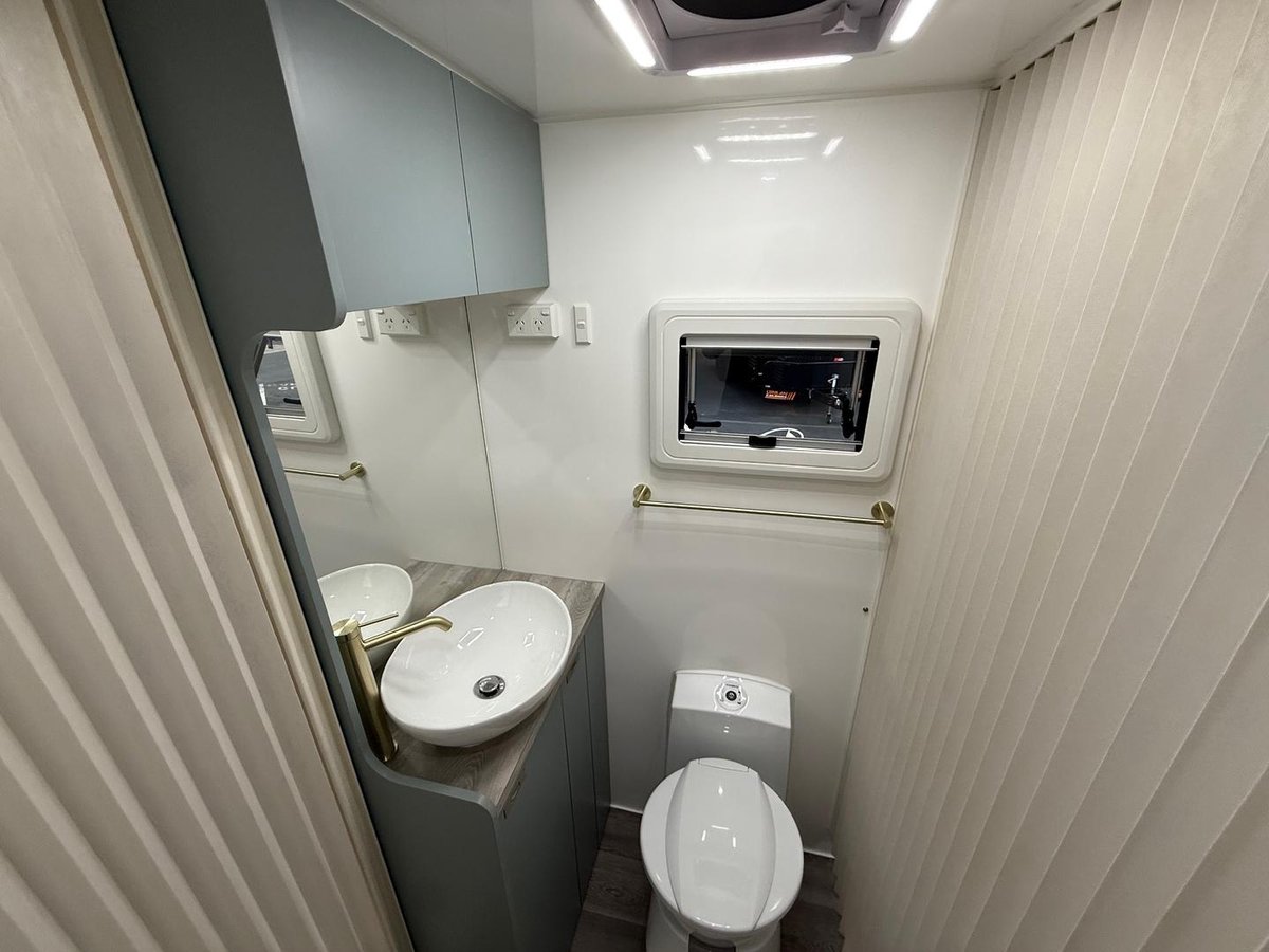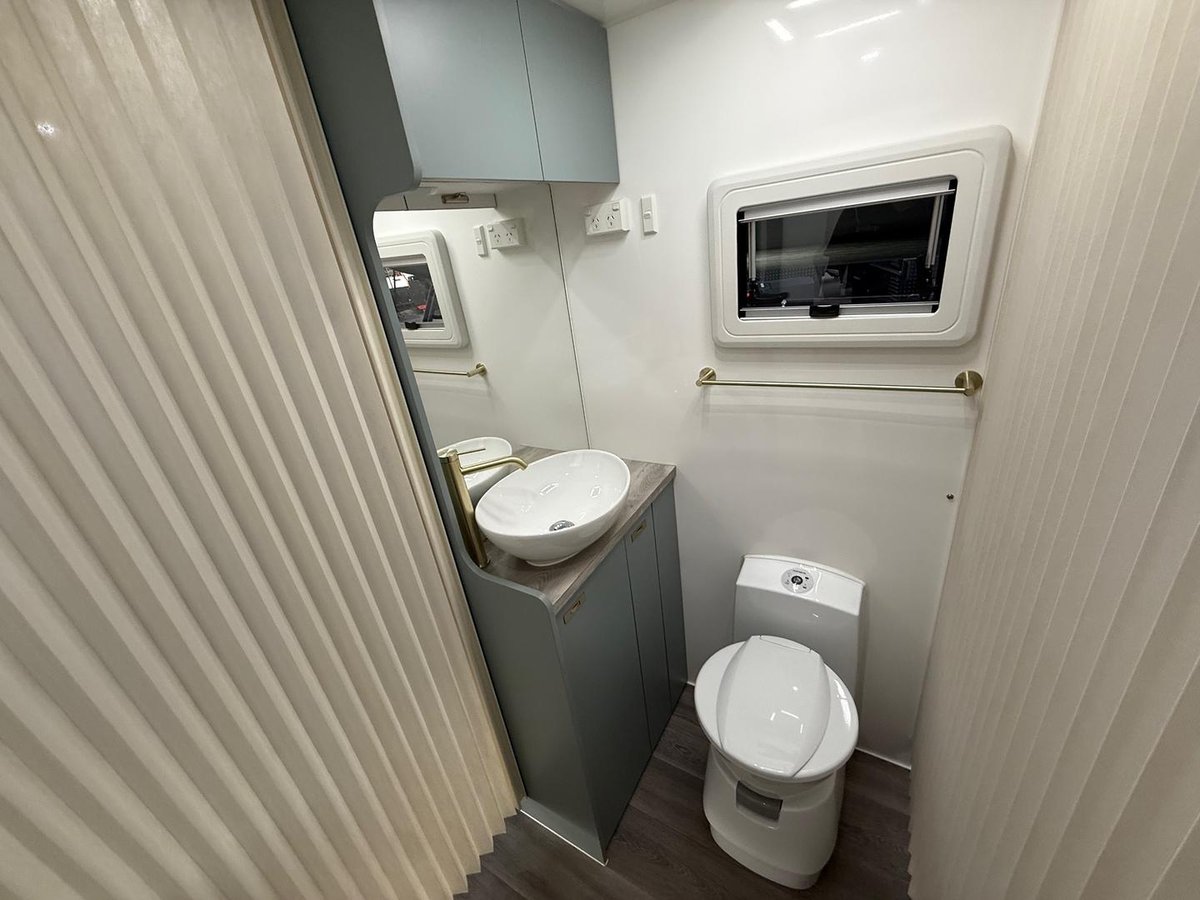 A full ensuite equipped with a ceramic vanity, moulded shower, and Dometic swivel toilet for your comfort