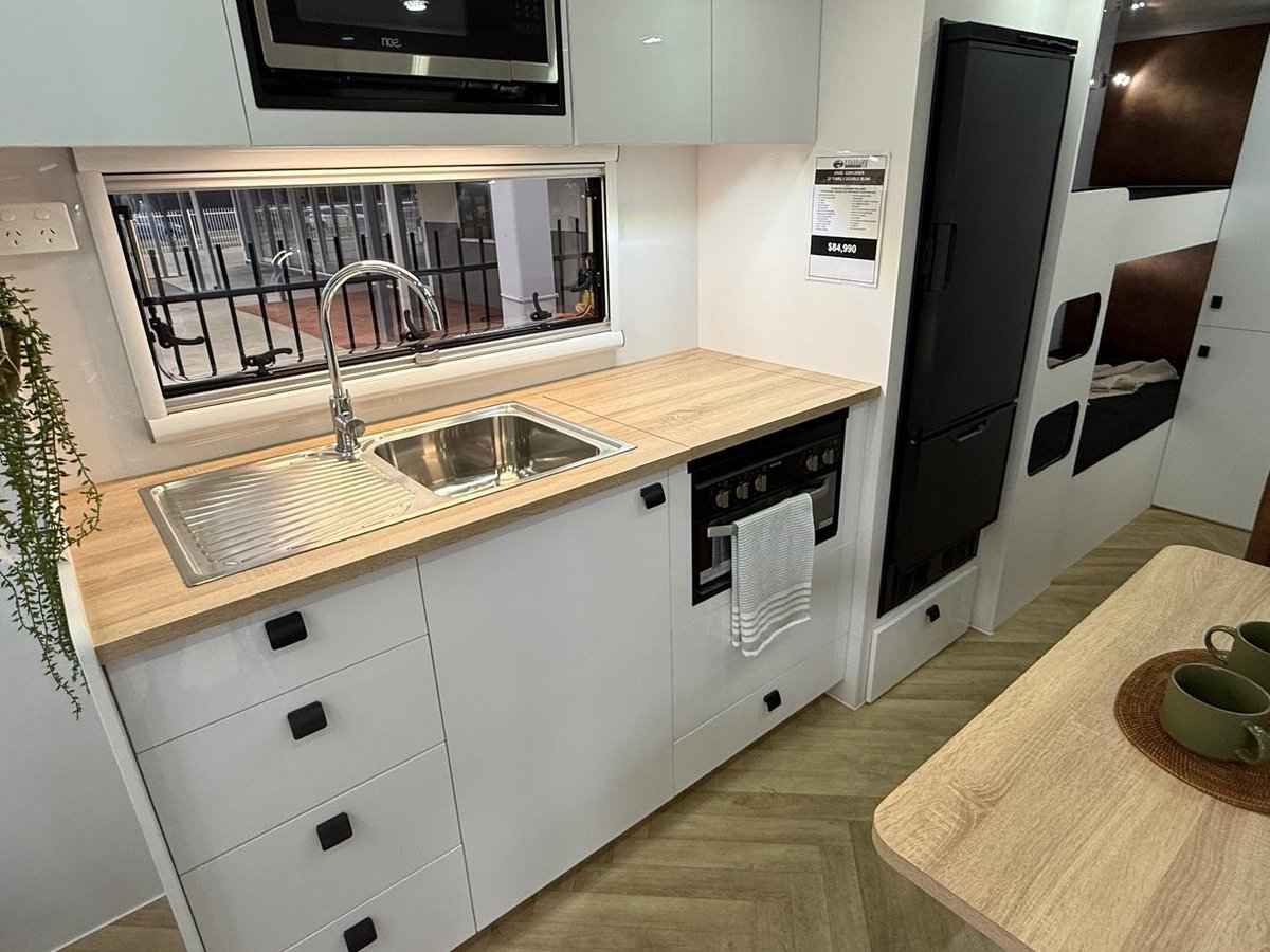 The Vivid Explorer 21’ Family Double Bunk is built for durability, efficiency and family touring comfort. Using advanced Polytech construction with a TIG-welded alloy roof frame and honeycomb floor, this model combines strength with impressive weight savings. Designed to handle Australia’s off-road conditions while keeping the whole family comfortable on long trips.