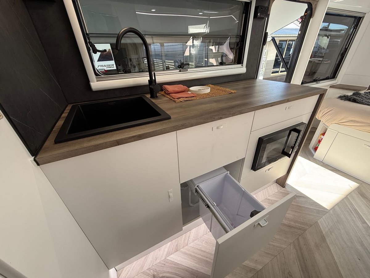 Clean look kitchen bench with space for portable induction, New 224L fridge, microwave, external washing machine with laundry chute, Gold Pack styling, waterfall bench, metal sided soft-close drawers, USB-C outlets