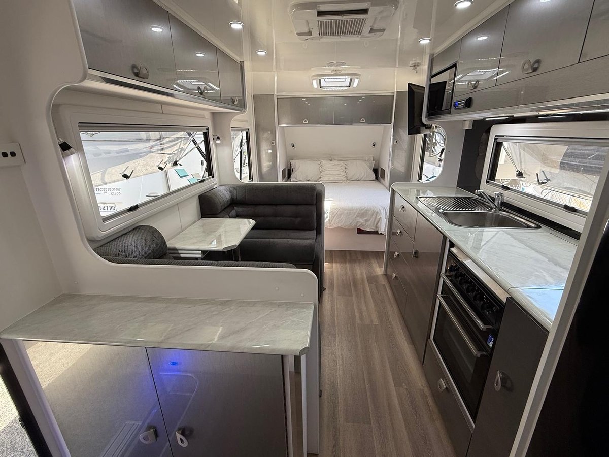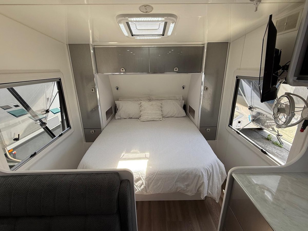 Caravan queen bed with overhead and under-bed storage