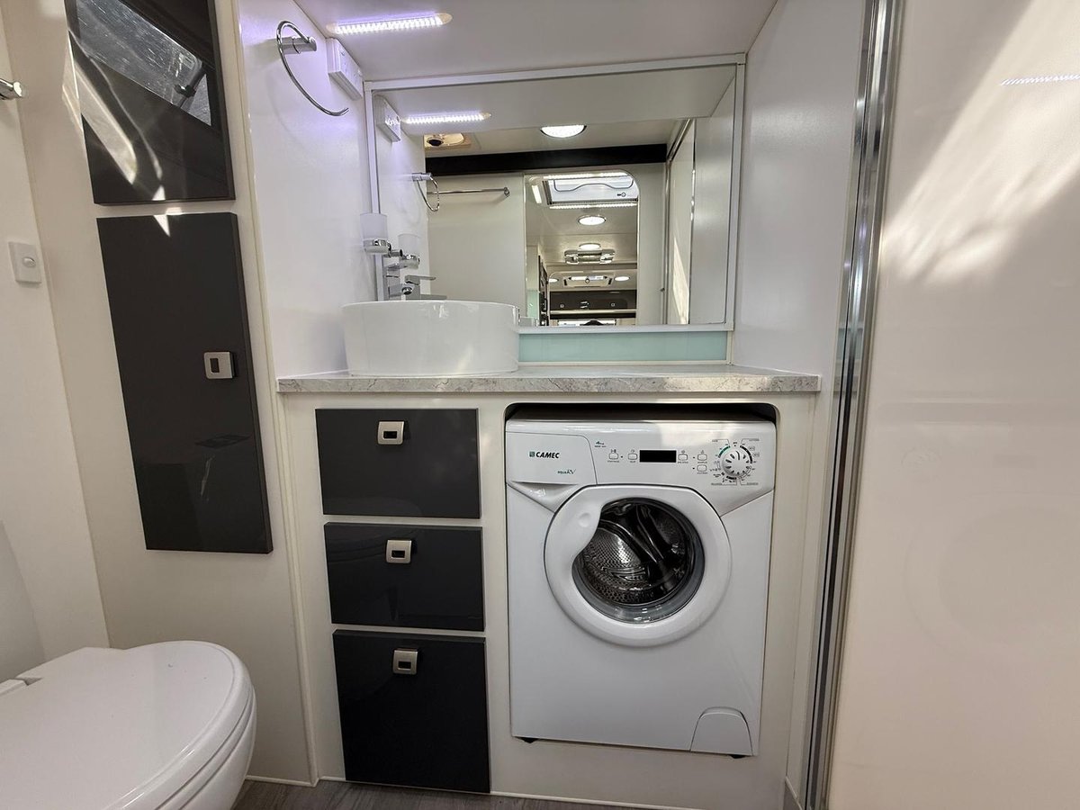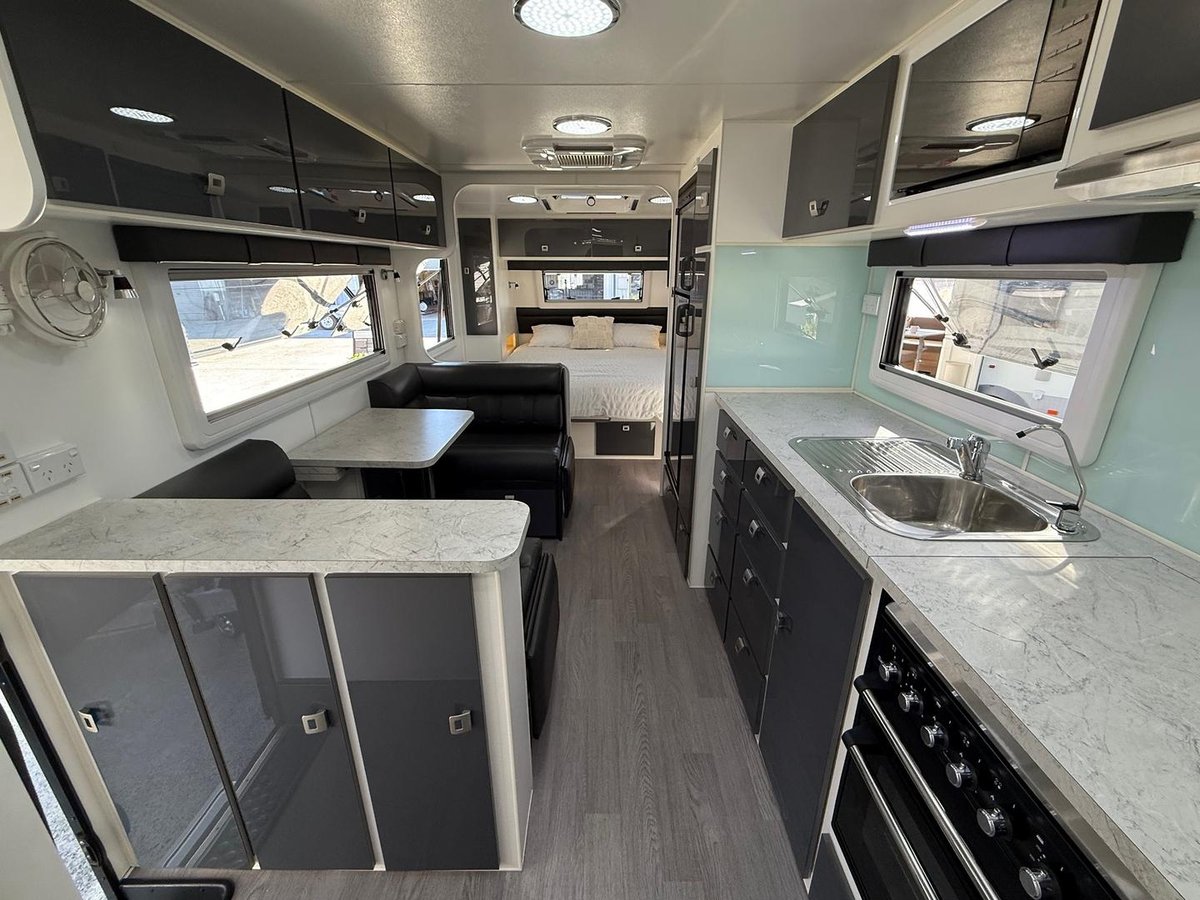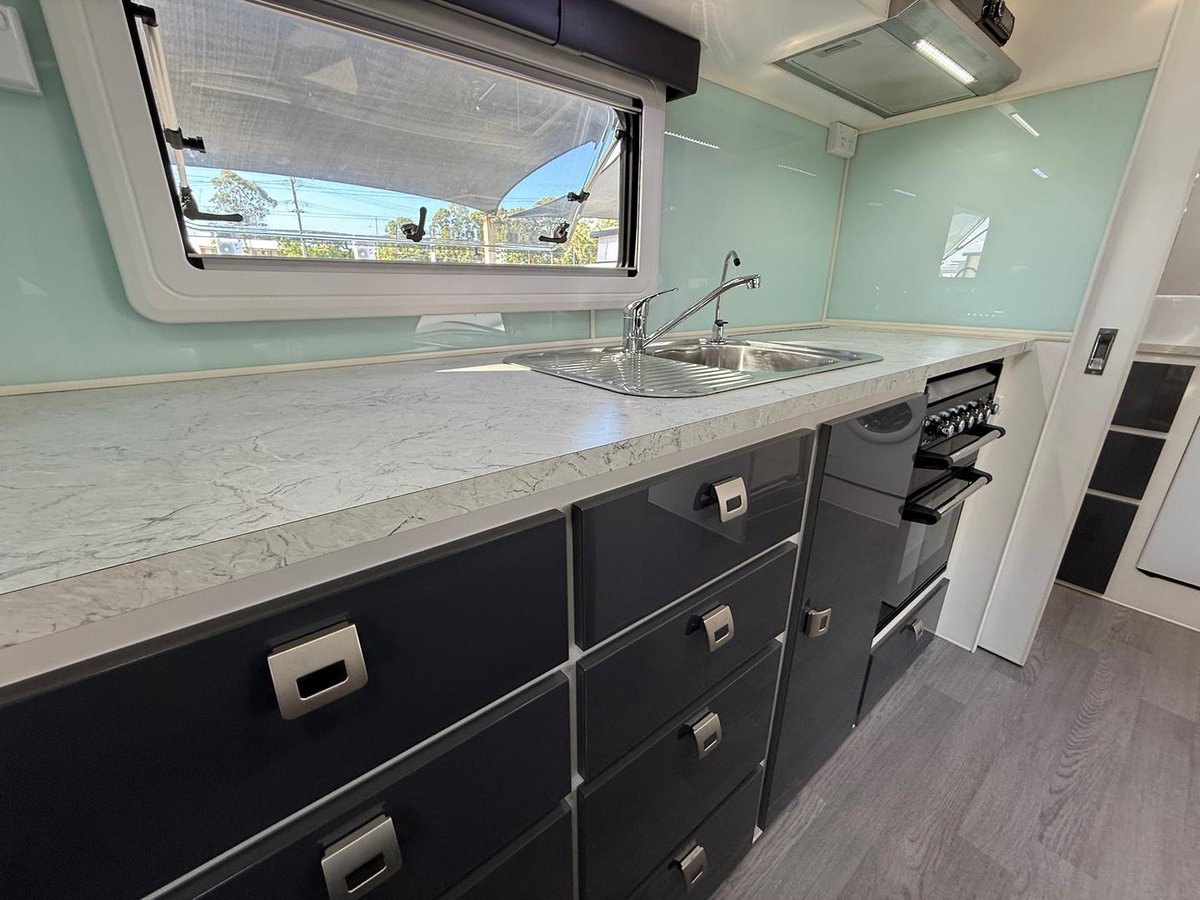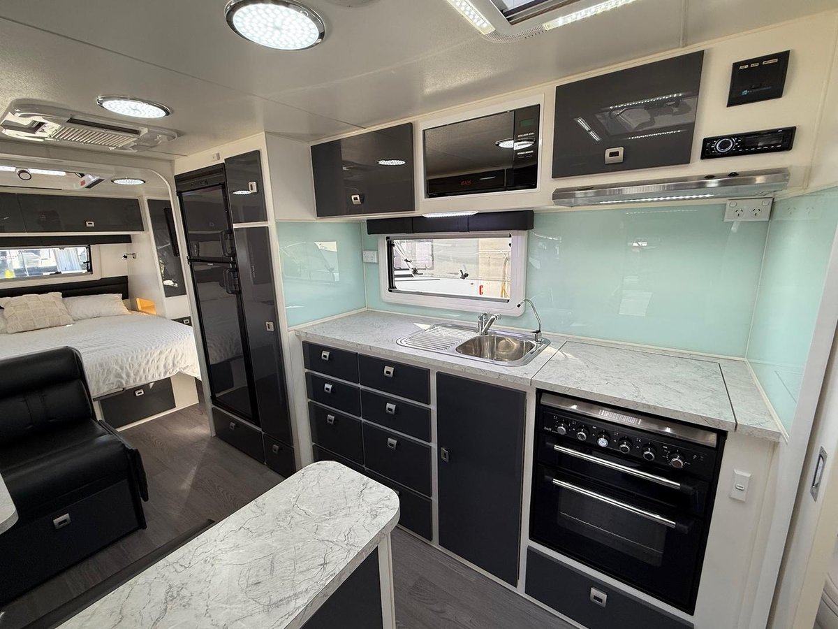 Loads of cupboards throughout inc. full height slide-out pantry & DOMETIC RPD218 compressor fridge & freezer.