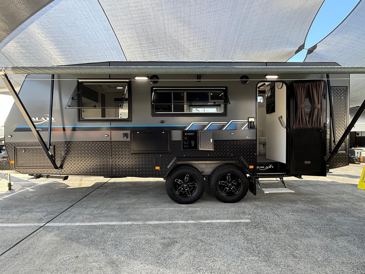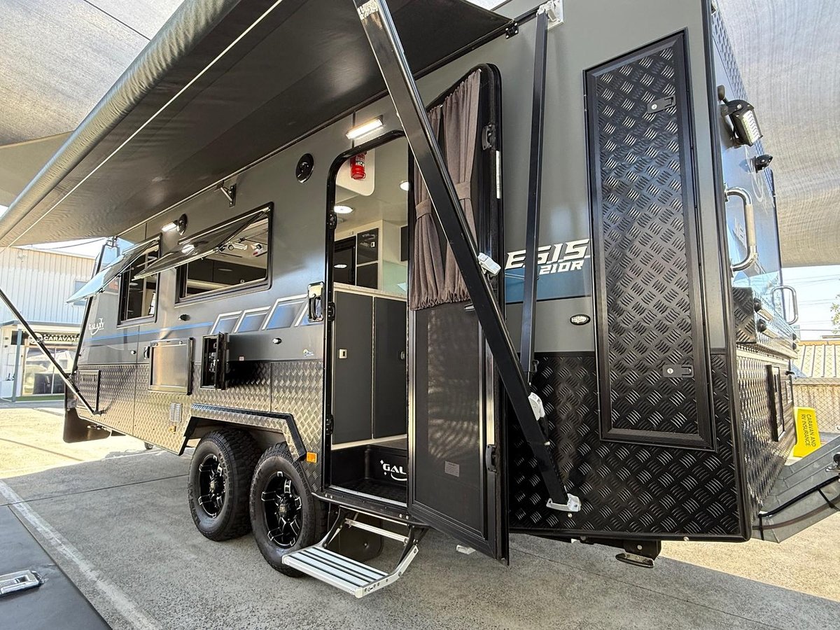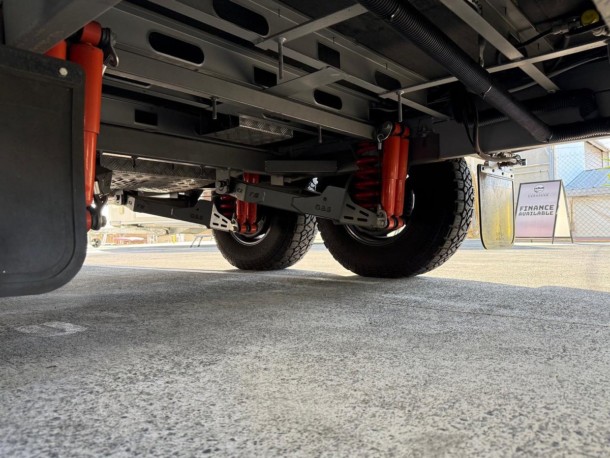 Dual shock trailing arm independent suspension, large roll out awning with centre support cradle.