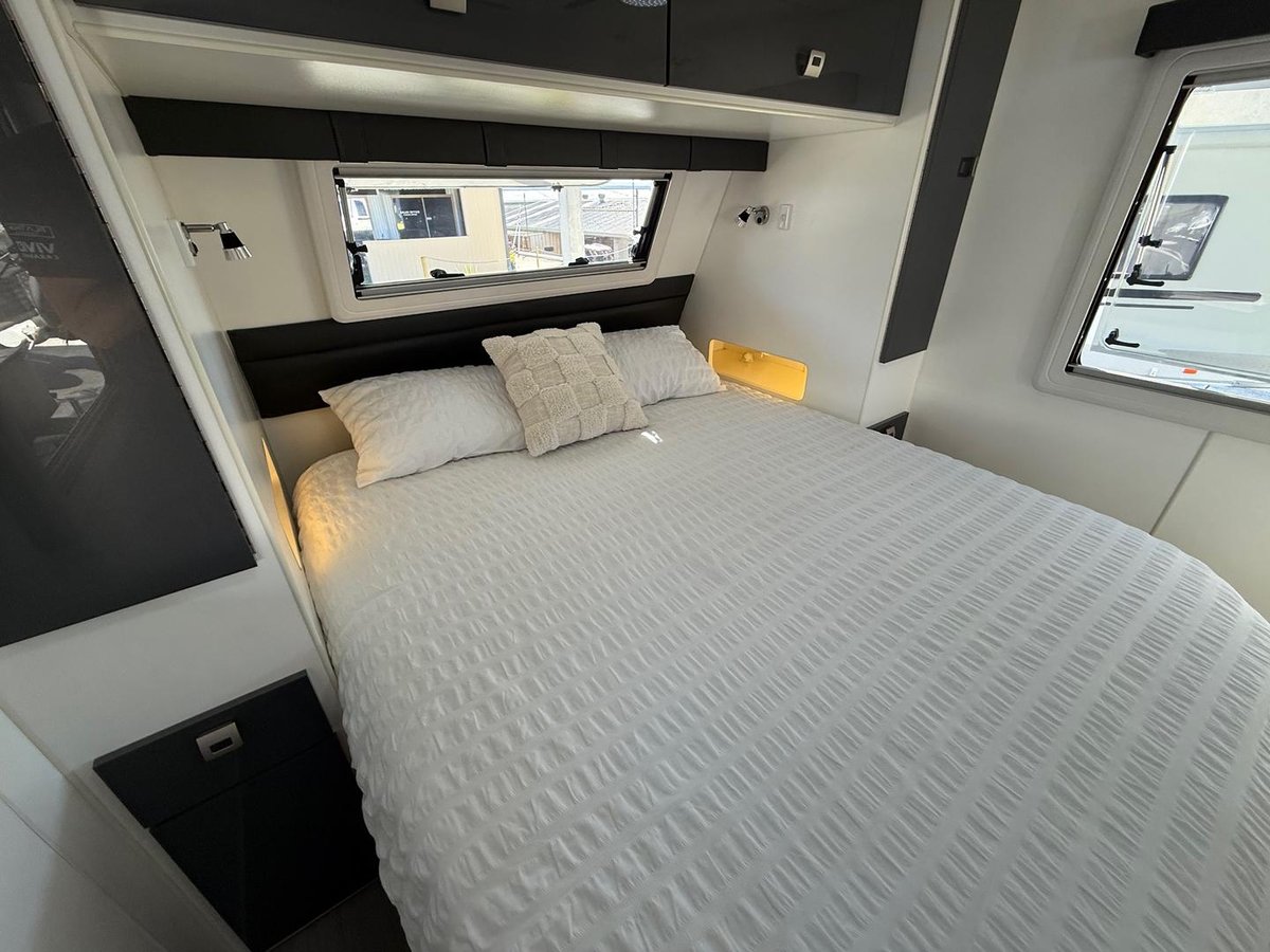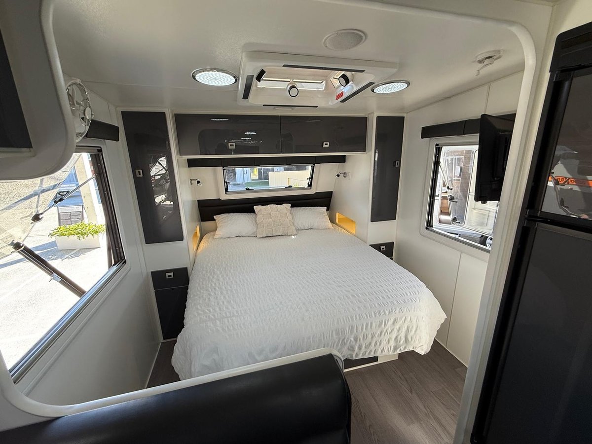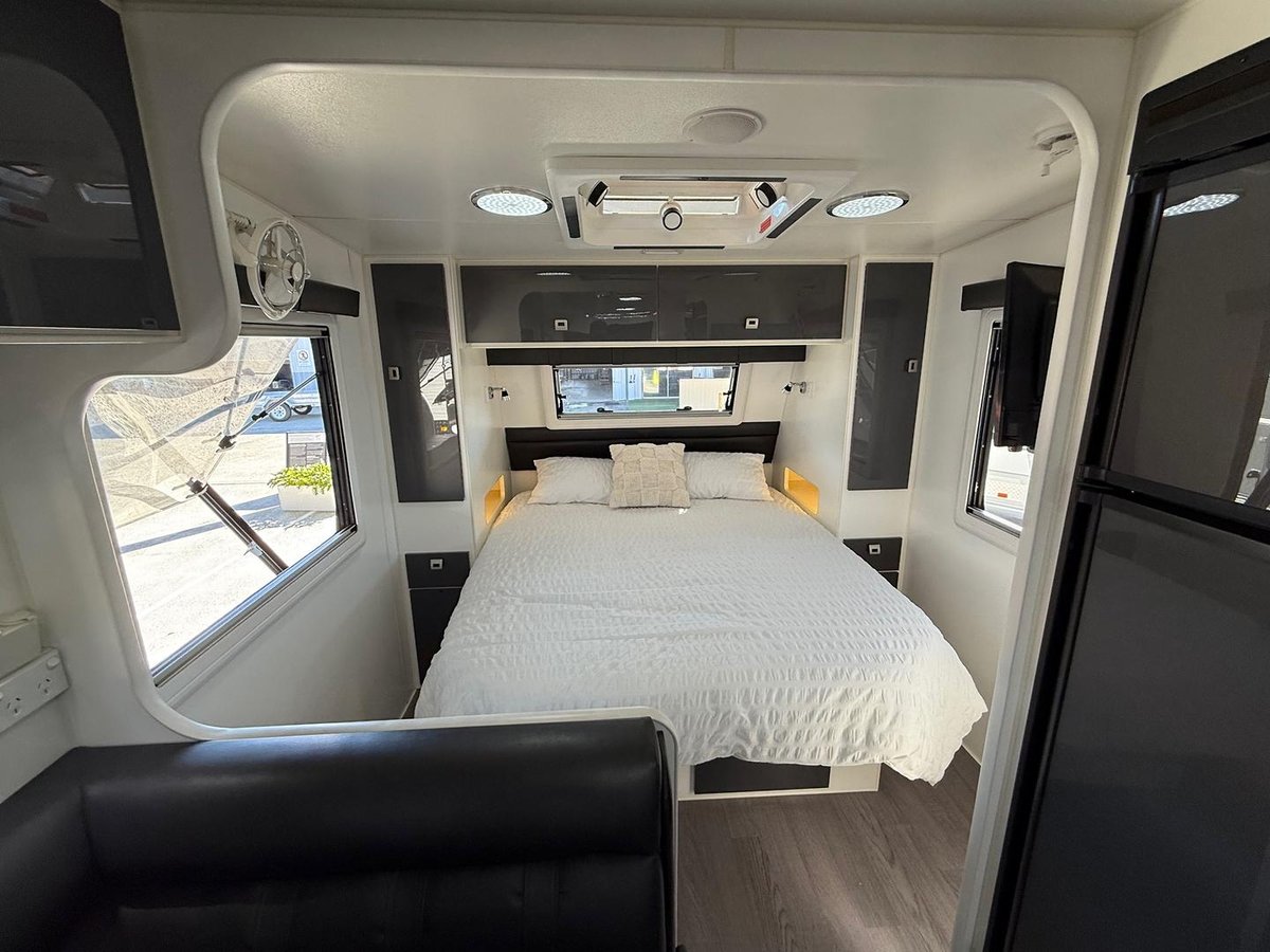 Queens sized island bed with underbed storage, oversized gal lines front tunnel boot.