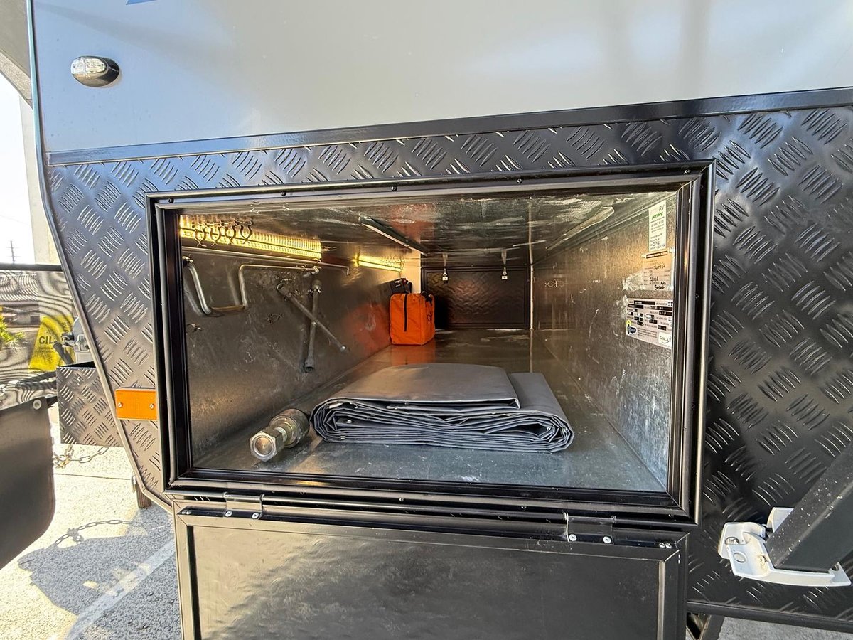Stone deflector on drawbar, 2 x 9 kg. gas bottles, 2 x water tanks, 1 x dedicated drinking water tank, 1 x grey water tank.