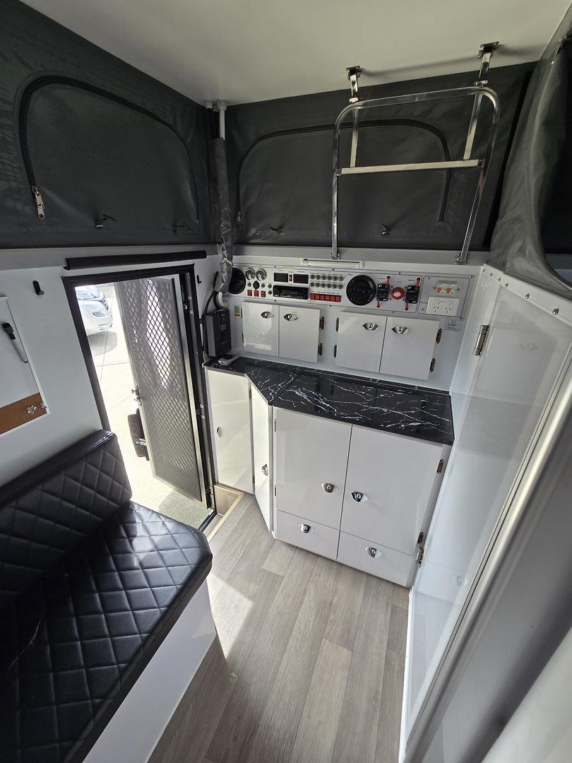 Slide out kitchen with 4 x gas burner cooktop & hot and cold sink.