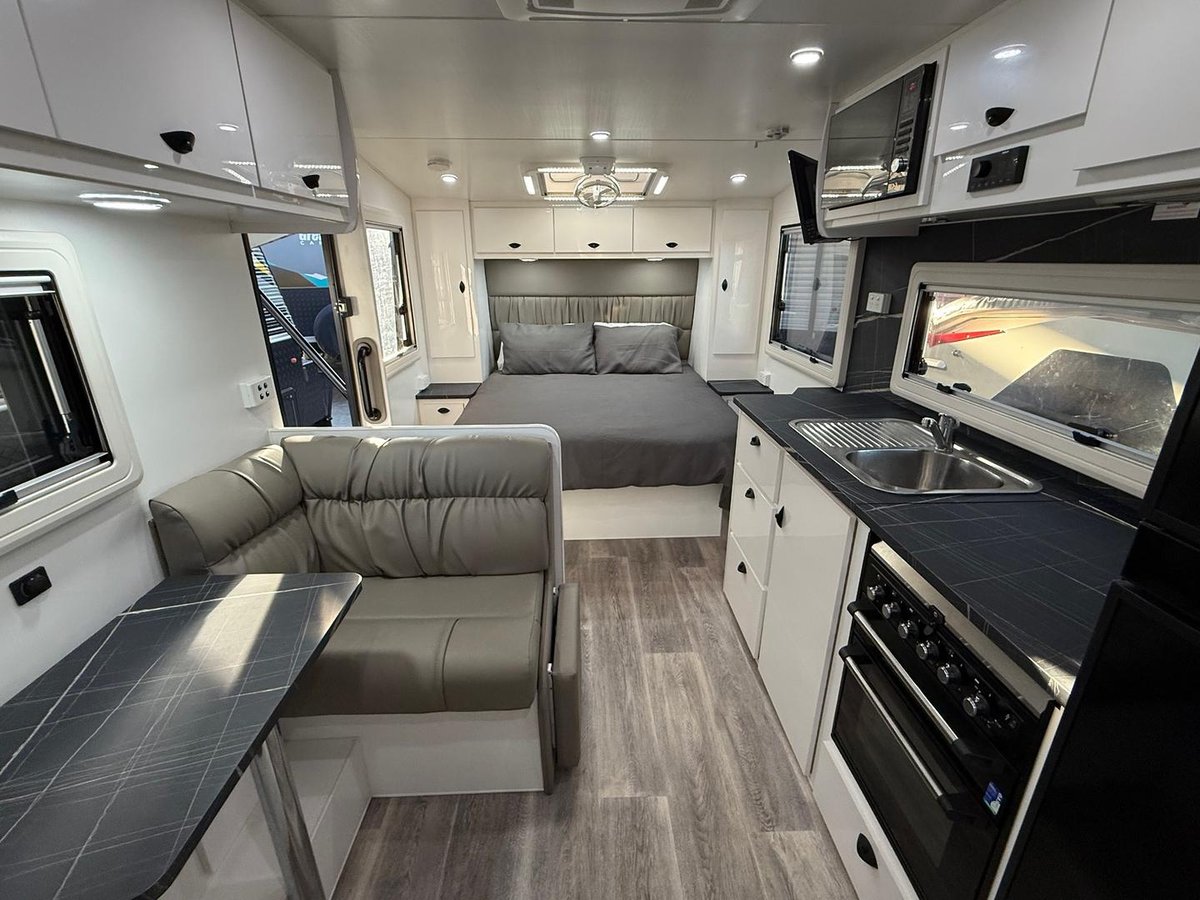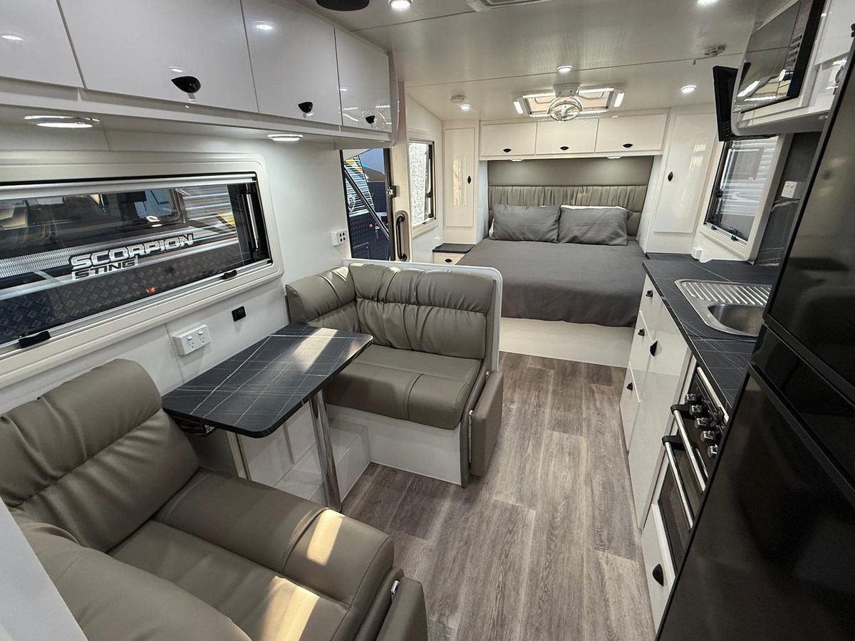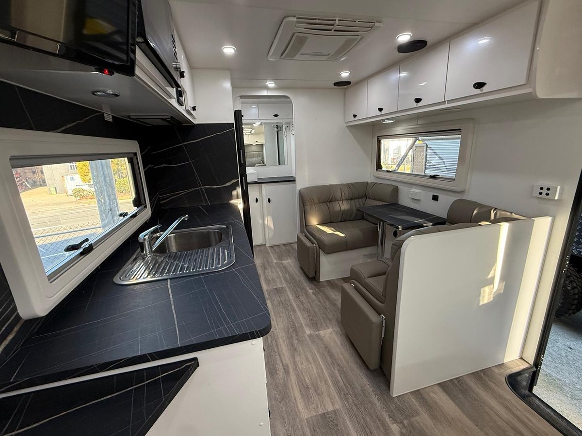 Interior Comfort: 25mm benchtops, steel-sided drawers, innerspring mattress, upholstered seating, LED lighting, vanity mirror, 12V Sirocco fan, and a one-piece floor for durability.