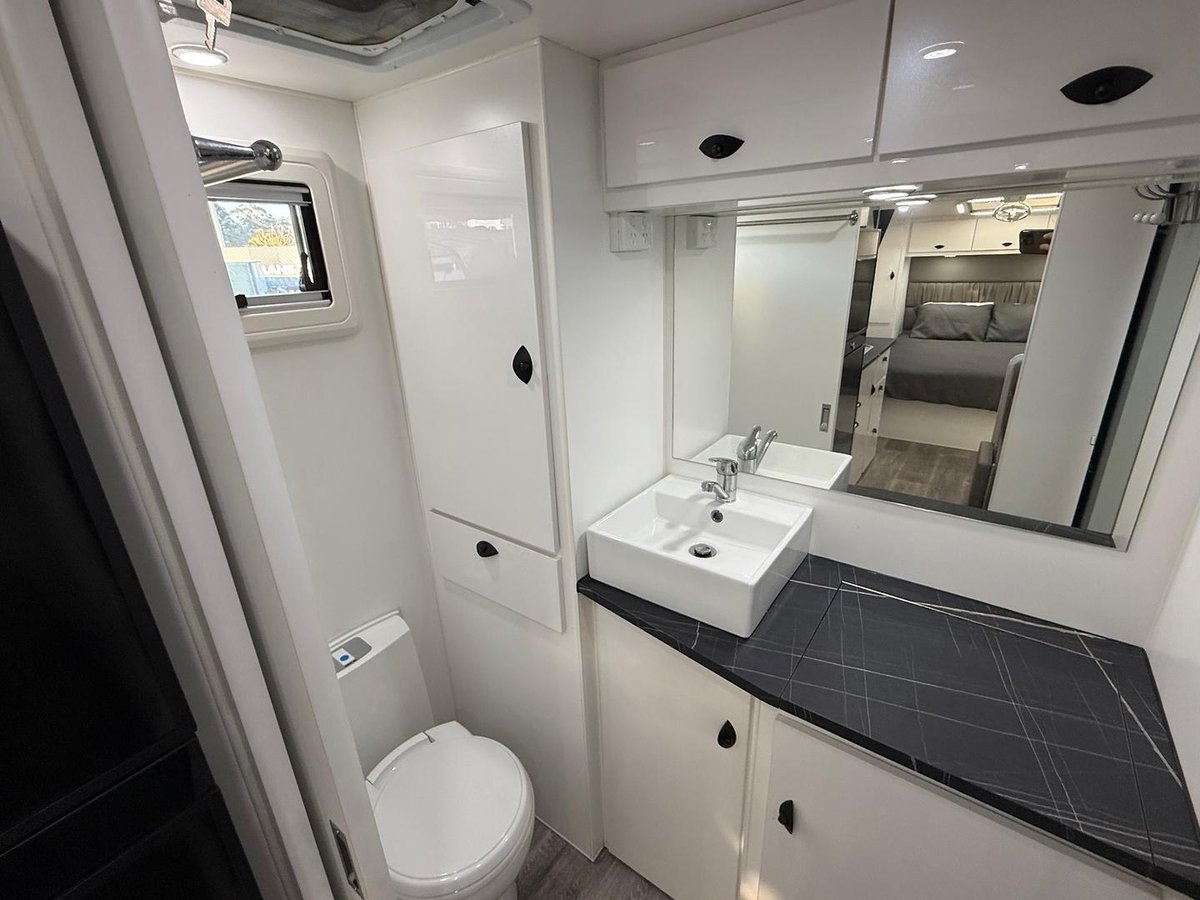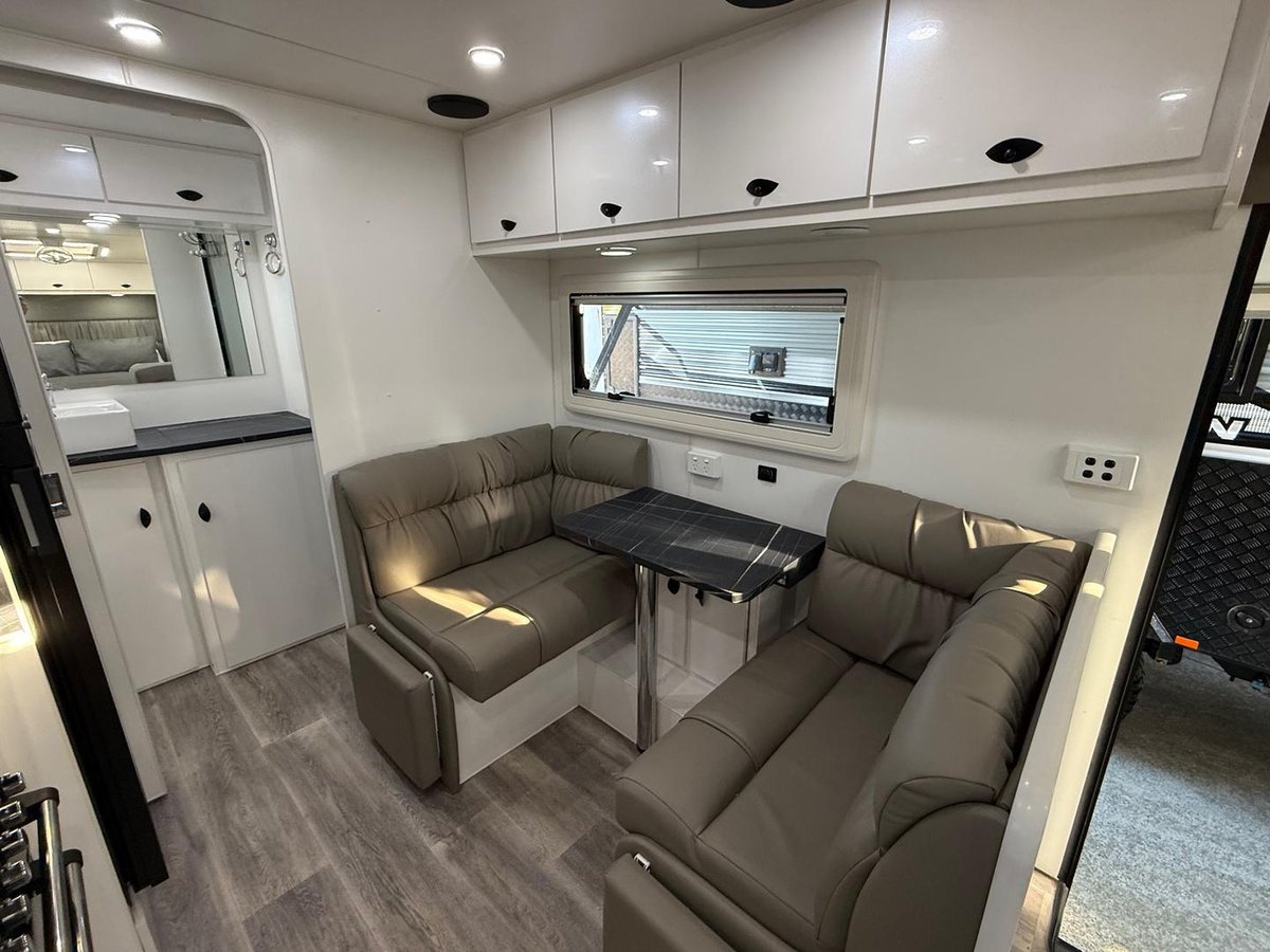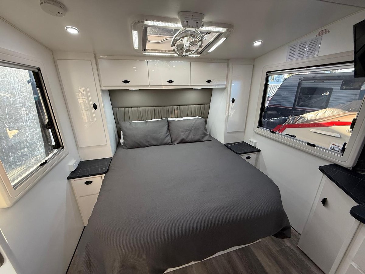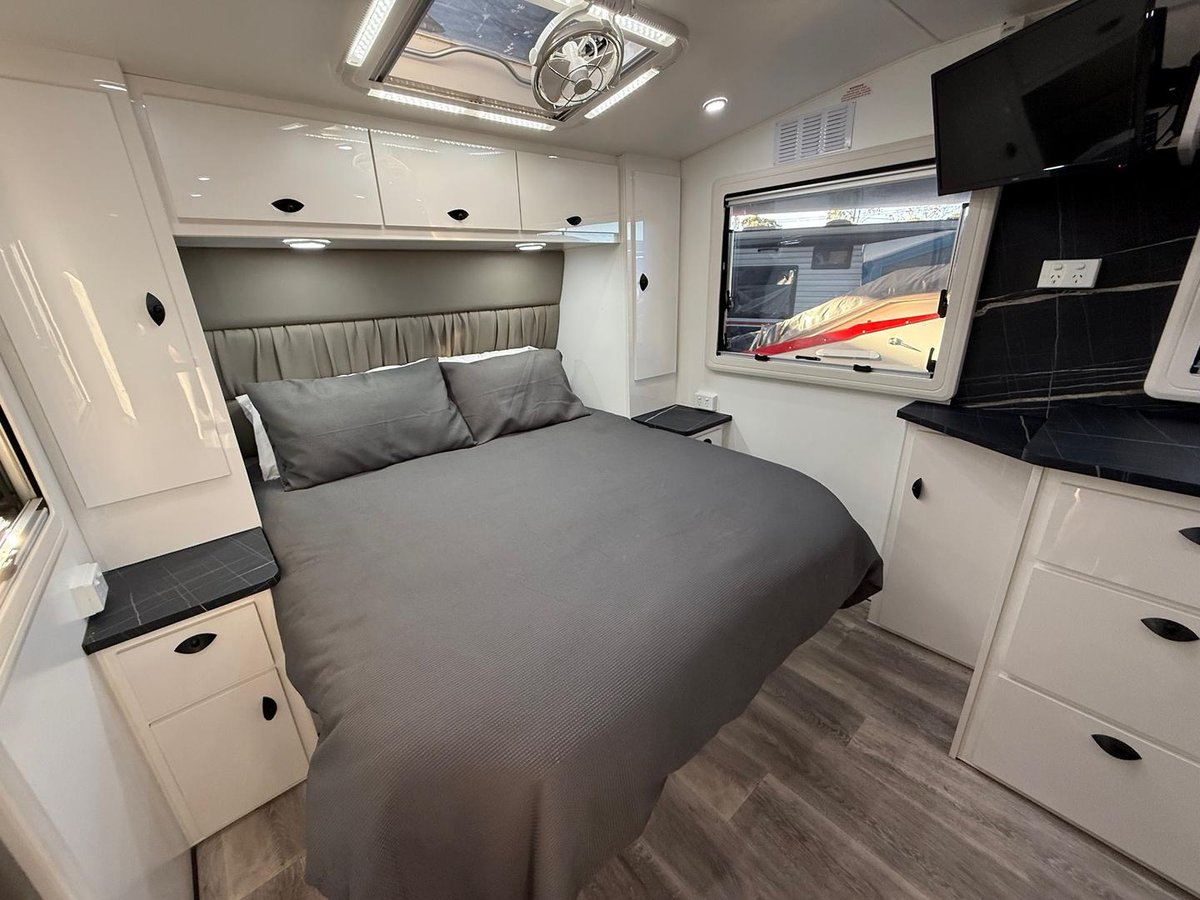 Interior Comfort: 25mm benchtops, steel-sided drawers, innerspring mattress, upholstered seating, LED lighting, vanity mirror, 12V Sirocco fan, and a one-piece floor for durability.