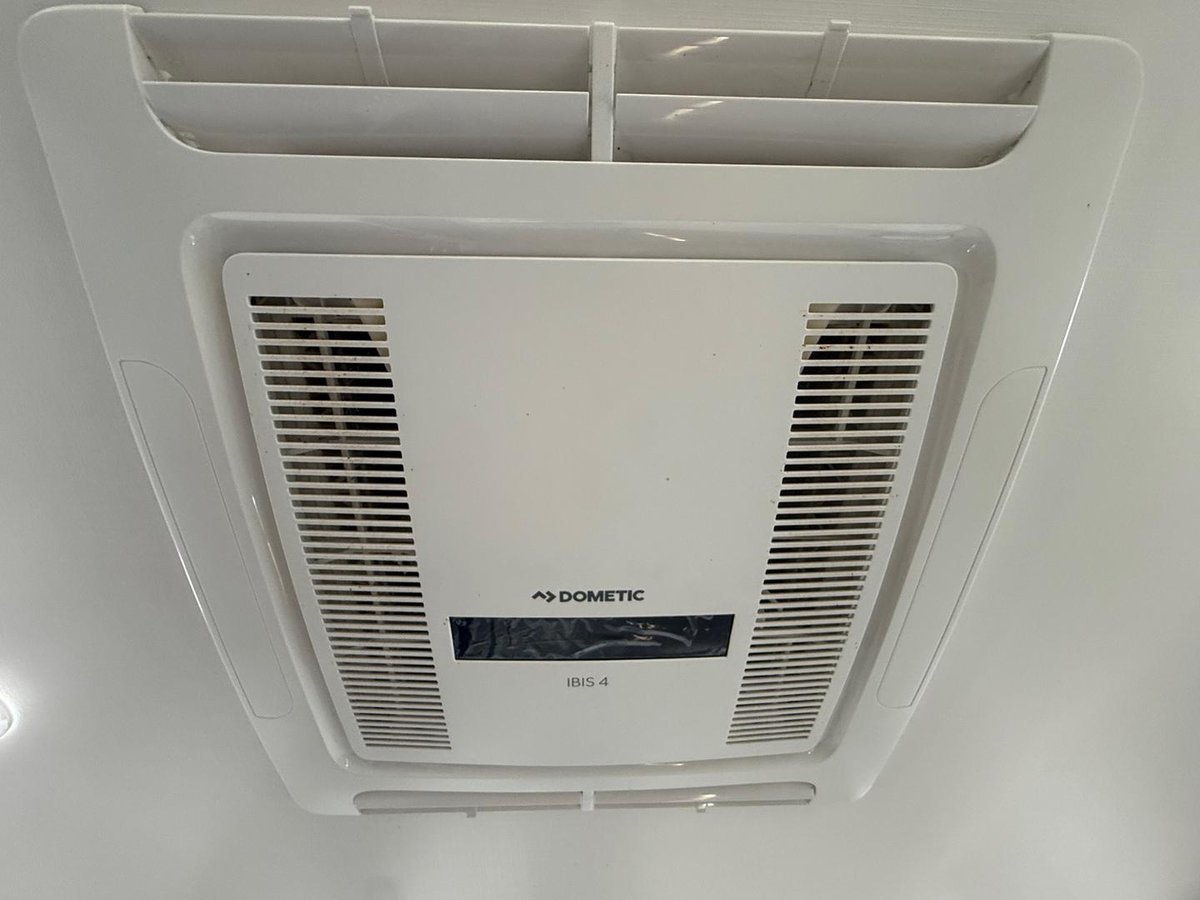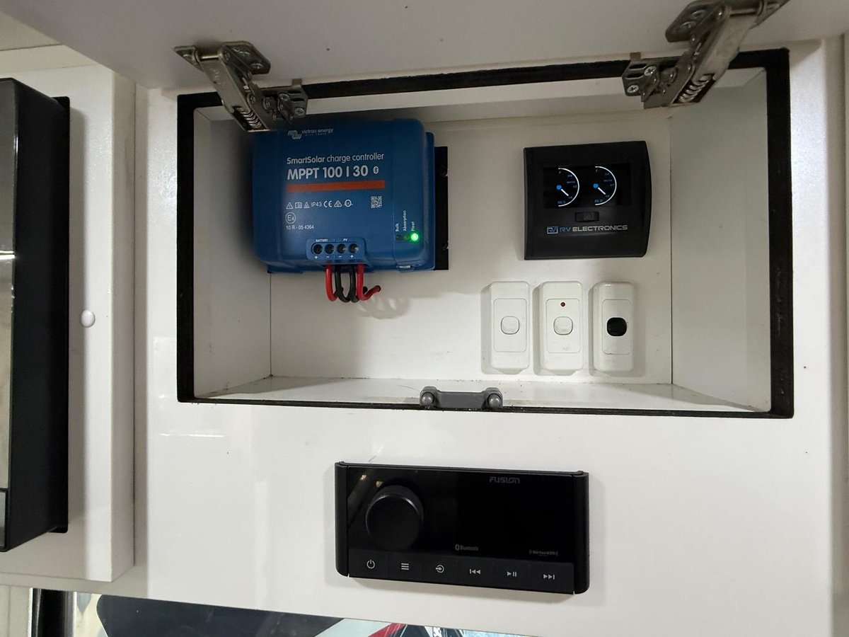 Electrical System: 2 x 170W solar panels, 2 x 100Ah batteries, 30A solar regulator, battery charger, LED lights throughout, Fusion stereo system, internal/external speakers, Ibis 4 air conditioner, and a 24" TV/DVD combo.