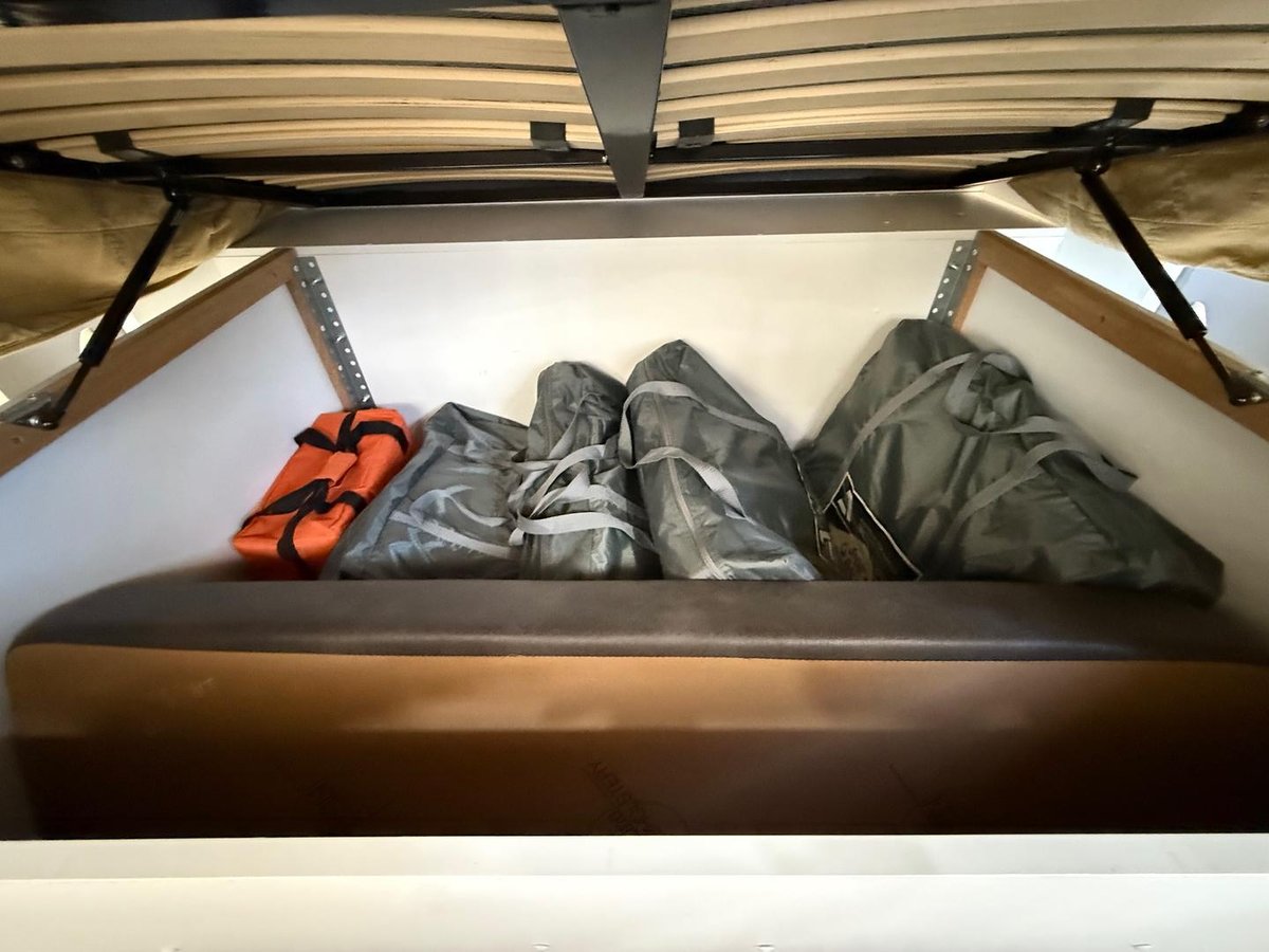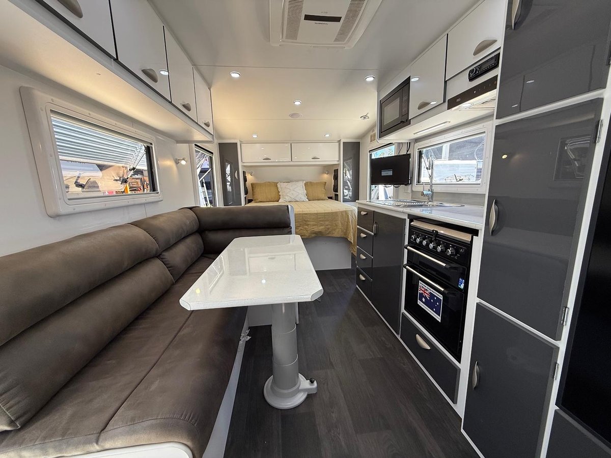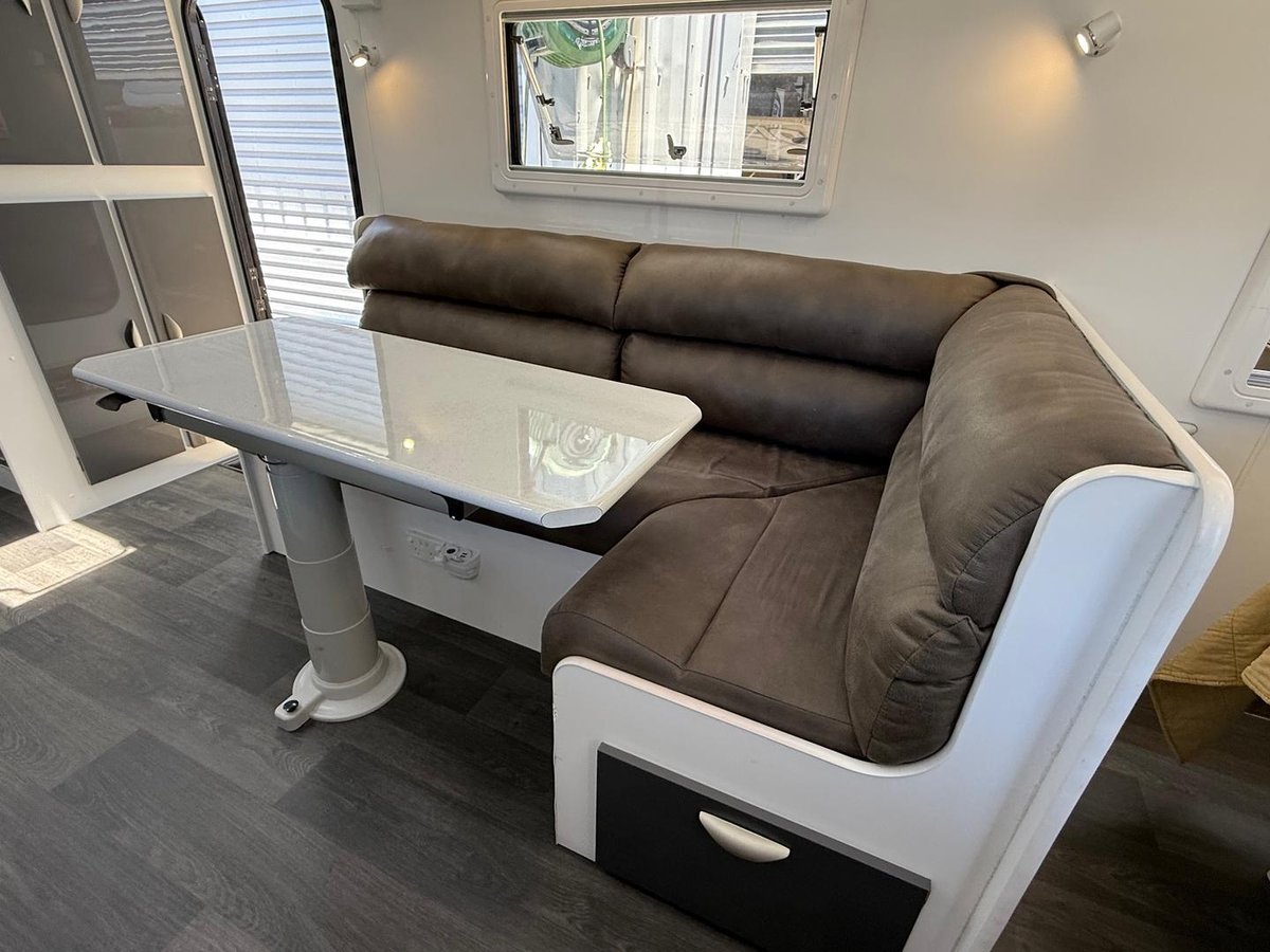 Roomy L-shaped dinette with Nuova Mapa leg & infill cushion to convert to extra bedding.