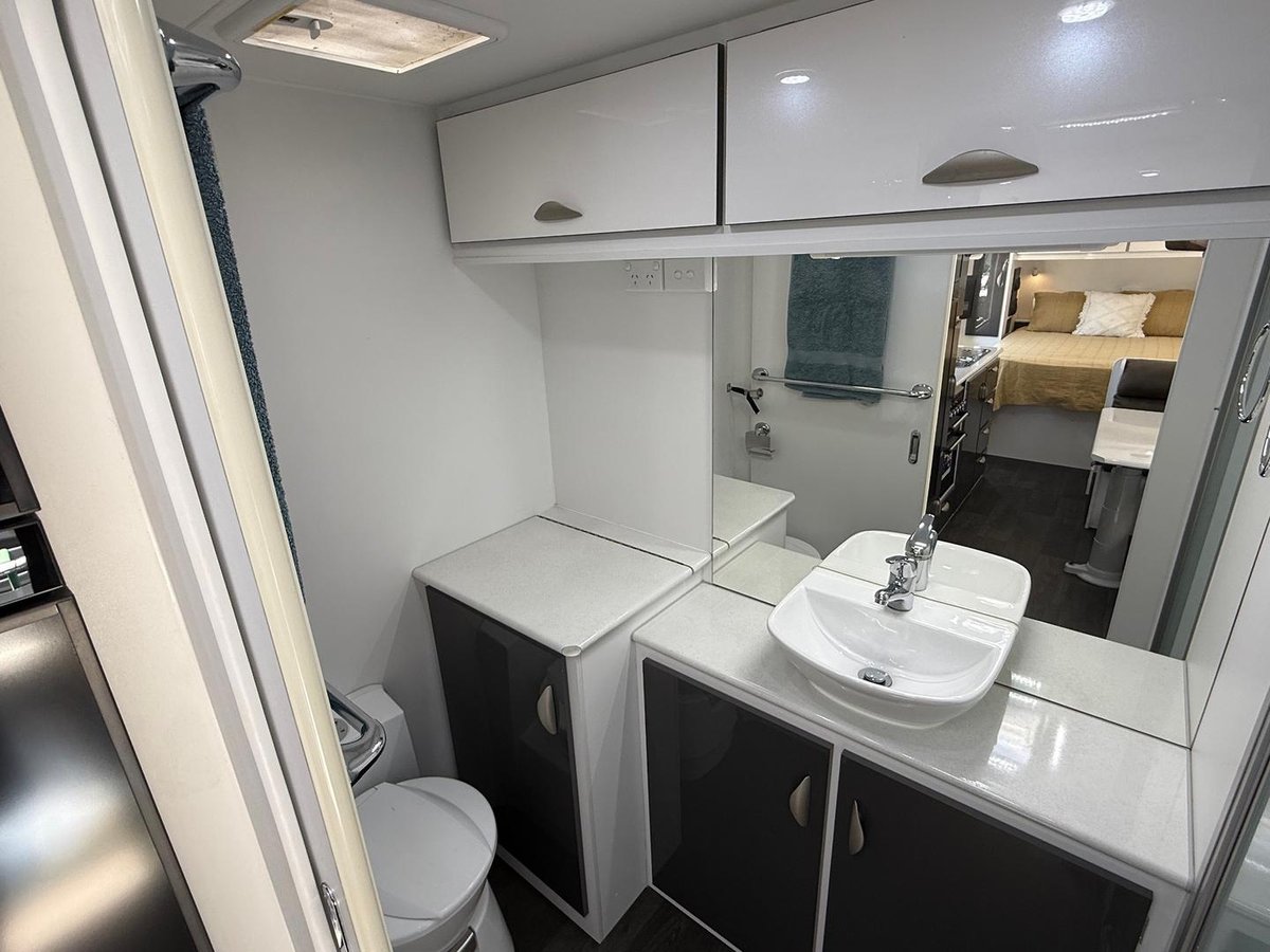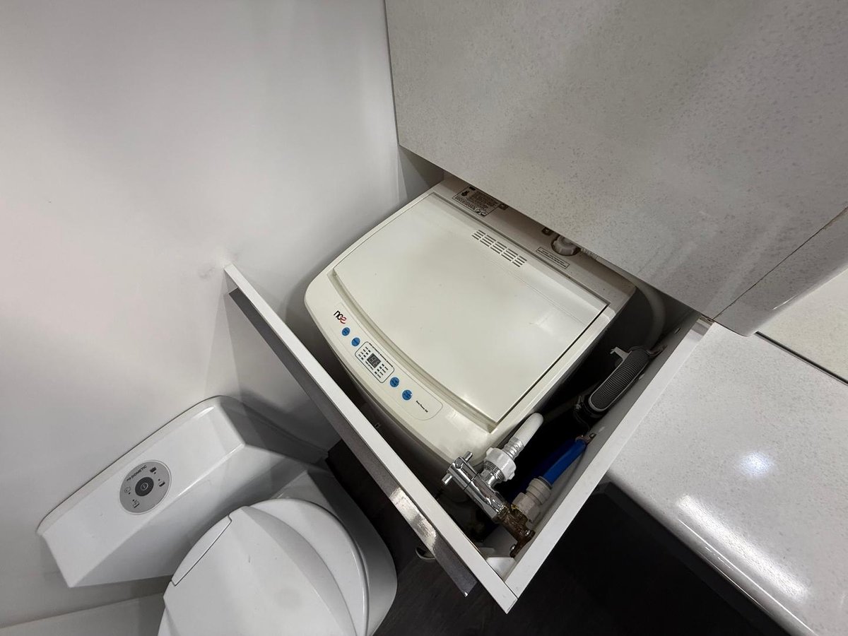 Ensuite with cassette toilet, vanity, shower & top load washing machine.