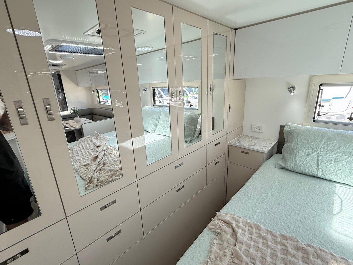Full bank of wardrobes and cupboards across the front of the Caravan.