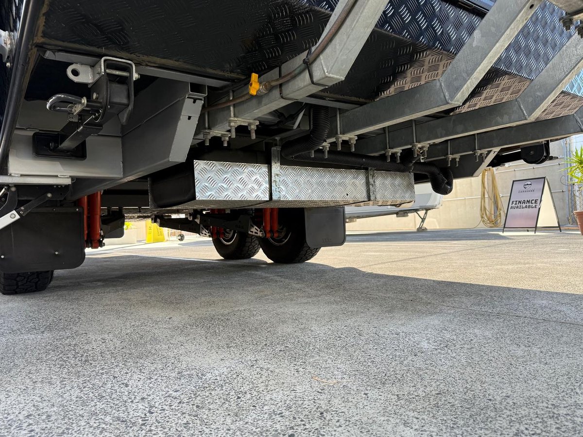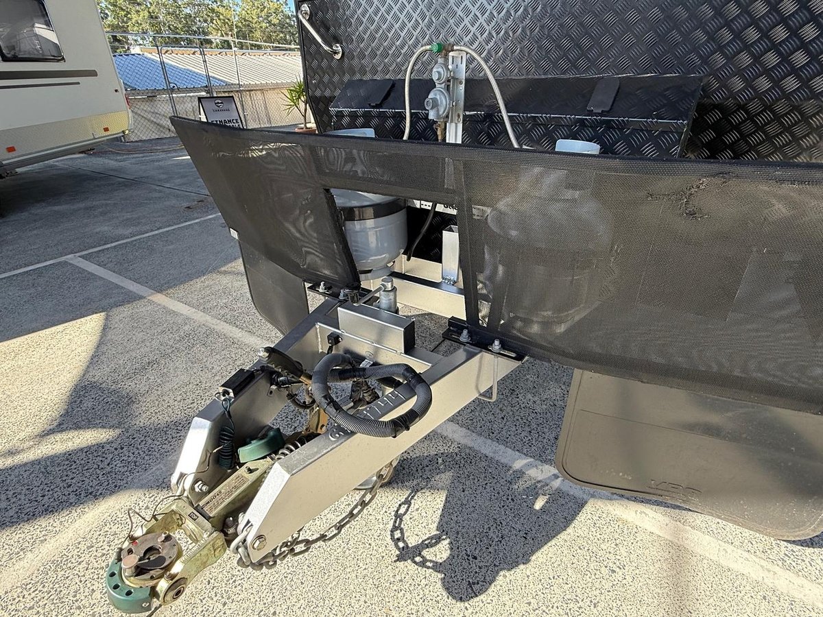 Stone deflector on drawbar, 2 x 9 kg. gas bottles, 2 x water tanks, 1 x dedicated drinking water tank, 1 x grey water tank.