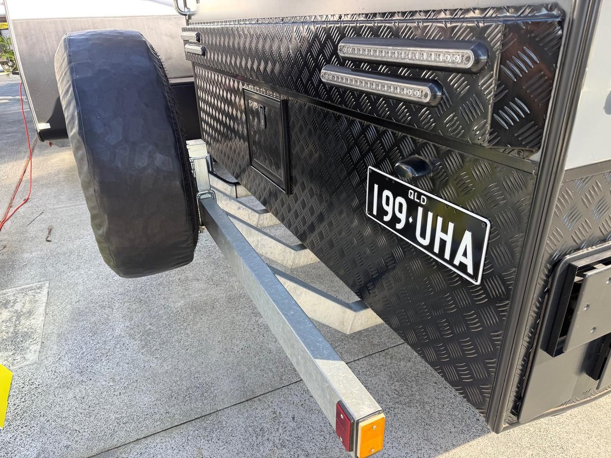 Dual shock trailing arm independent suspension, large roll out awning with centre support cradle.