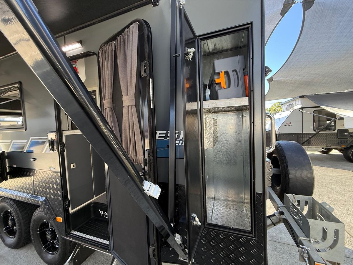 Queens sized island bed with underbed storage, oversized gal lines front tunnel boot.