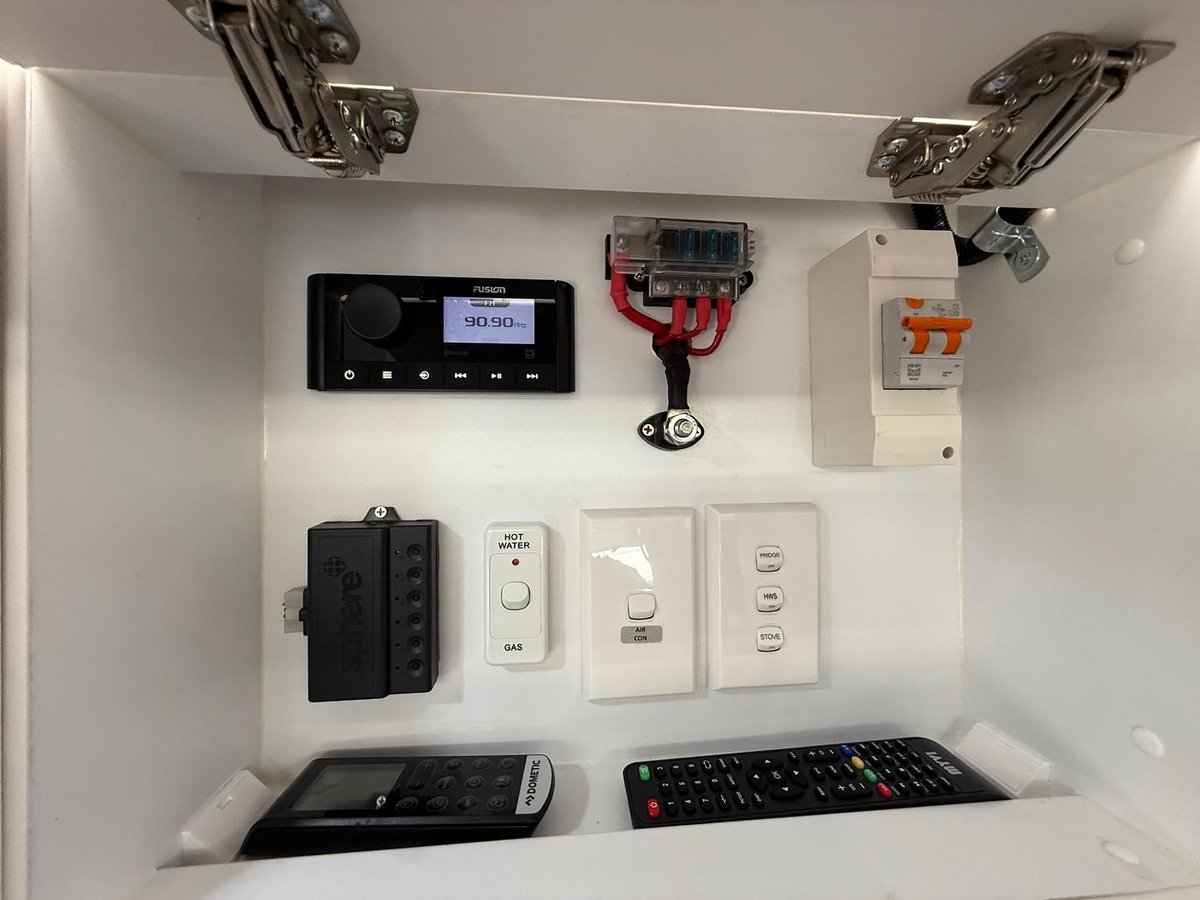 Entertainment hatch with TV bracket, antenna and 12V and 240V power outlets