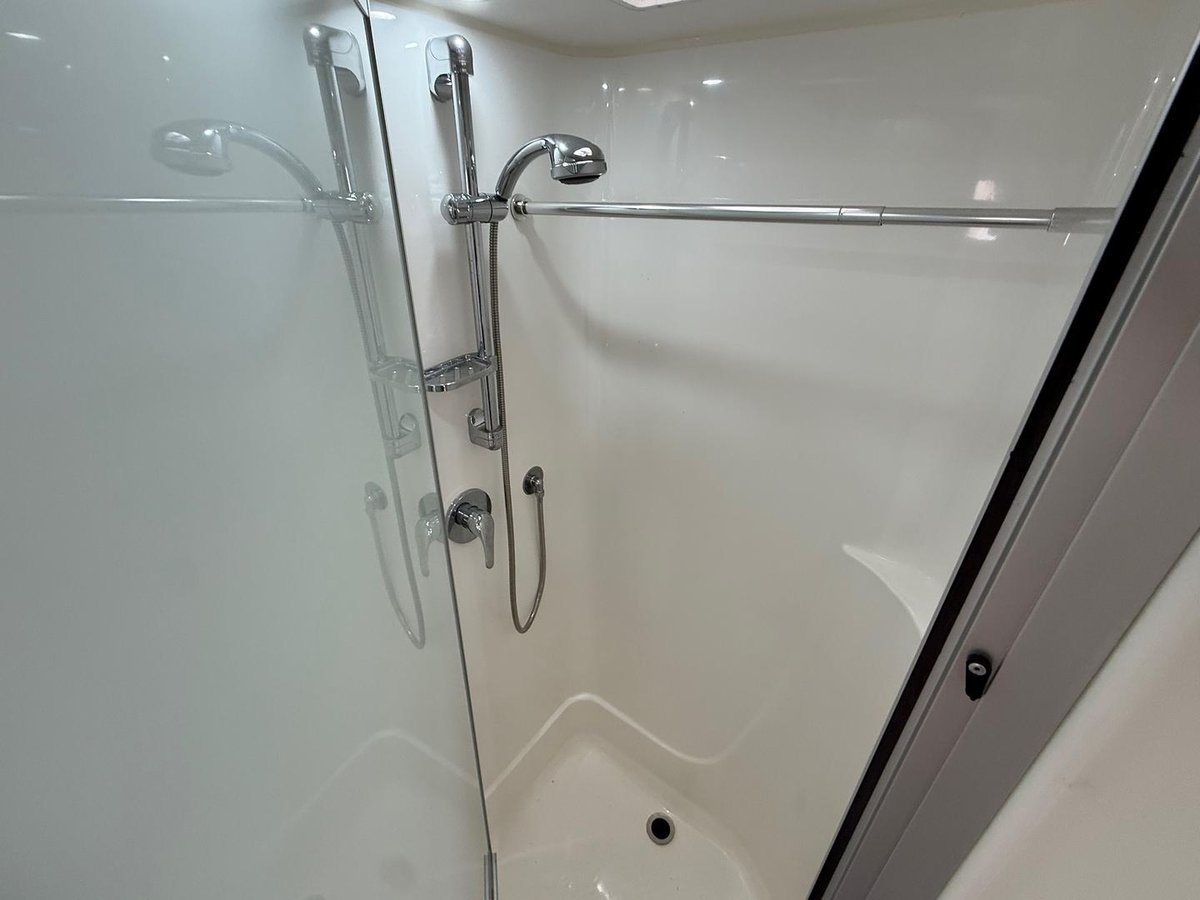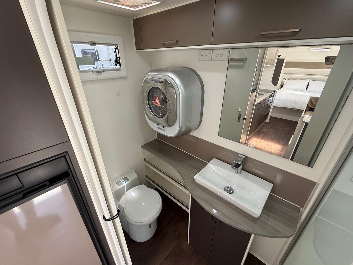 Separate shower, cassette toilet, vanity & wall mount washing machine.